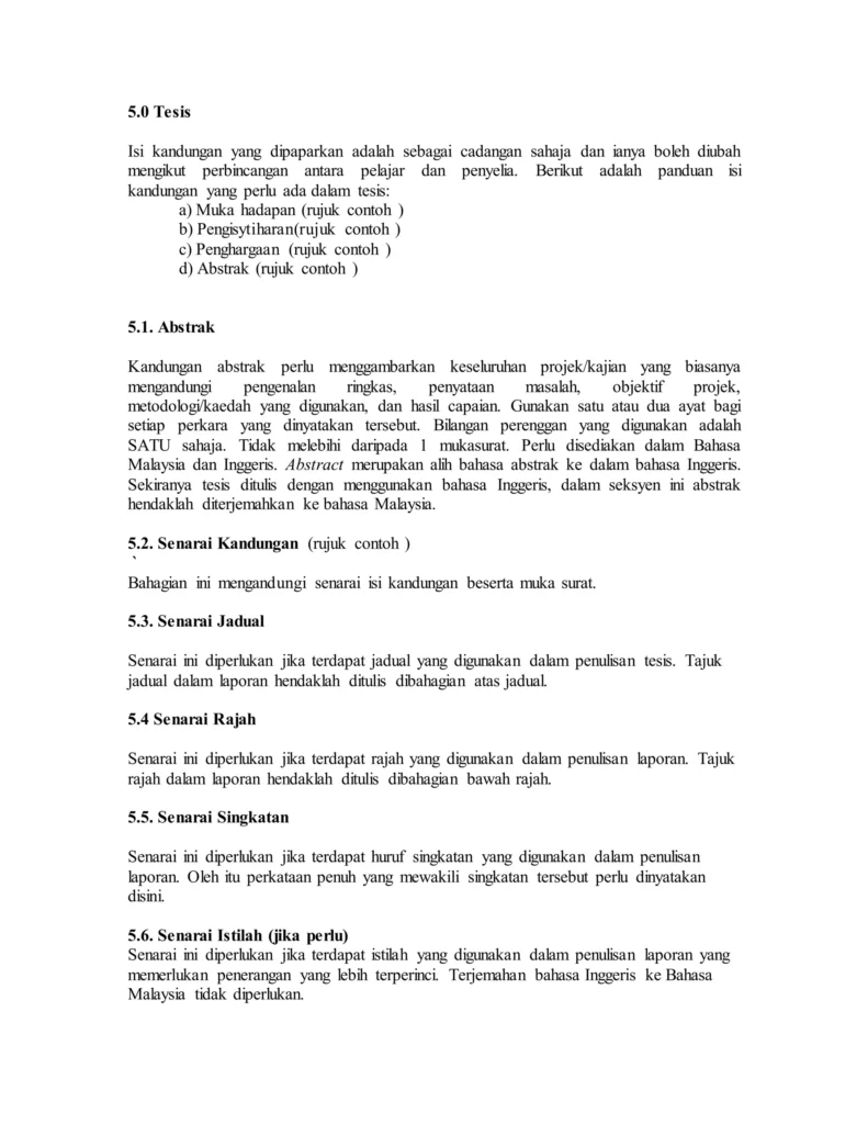 merupakan sumber penting yang membantu pelajar tahun akhir menyusun karya ilmiah mereka mengikut struktur yang betul dan profesional. Penulisan tesis atau Projek Tahun Akhir (FYP) bukan sahaja menguji pengetahuan akademik, tetapi juga kemahiran penyelidikan, analisis dan komunikasi bertulis. Dengan panduan yang jelas, pelajar dapat memahami susunan yang diperlukan seperti abstrak, pengenalan, kajian literatur, metodologi, dapatan, perbincangan dan kesimpulan. Panduan ini turut menekankan kepentingan gaya sitasi, rujukan dan format dokumen mengikut keperluan institusi. Penggunaan memastikan kualiti dan keseragaman kerja akhir pelajar.