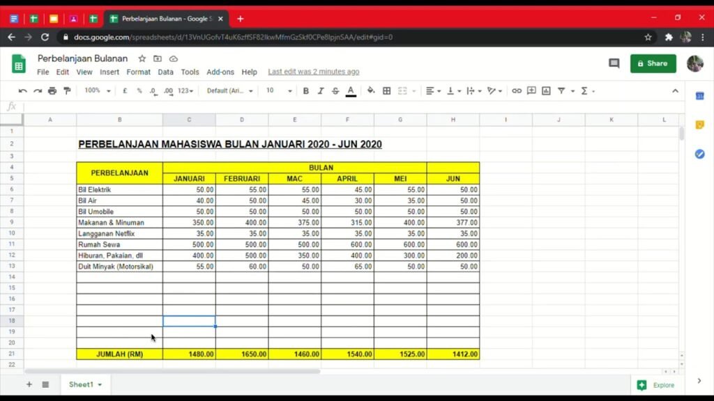 Contoh Jadual Perbelanjaan Bulanan Menggunakan Excel