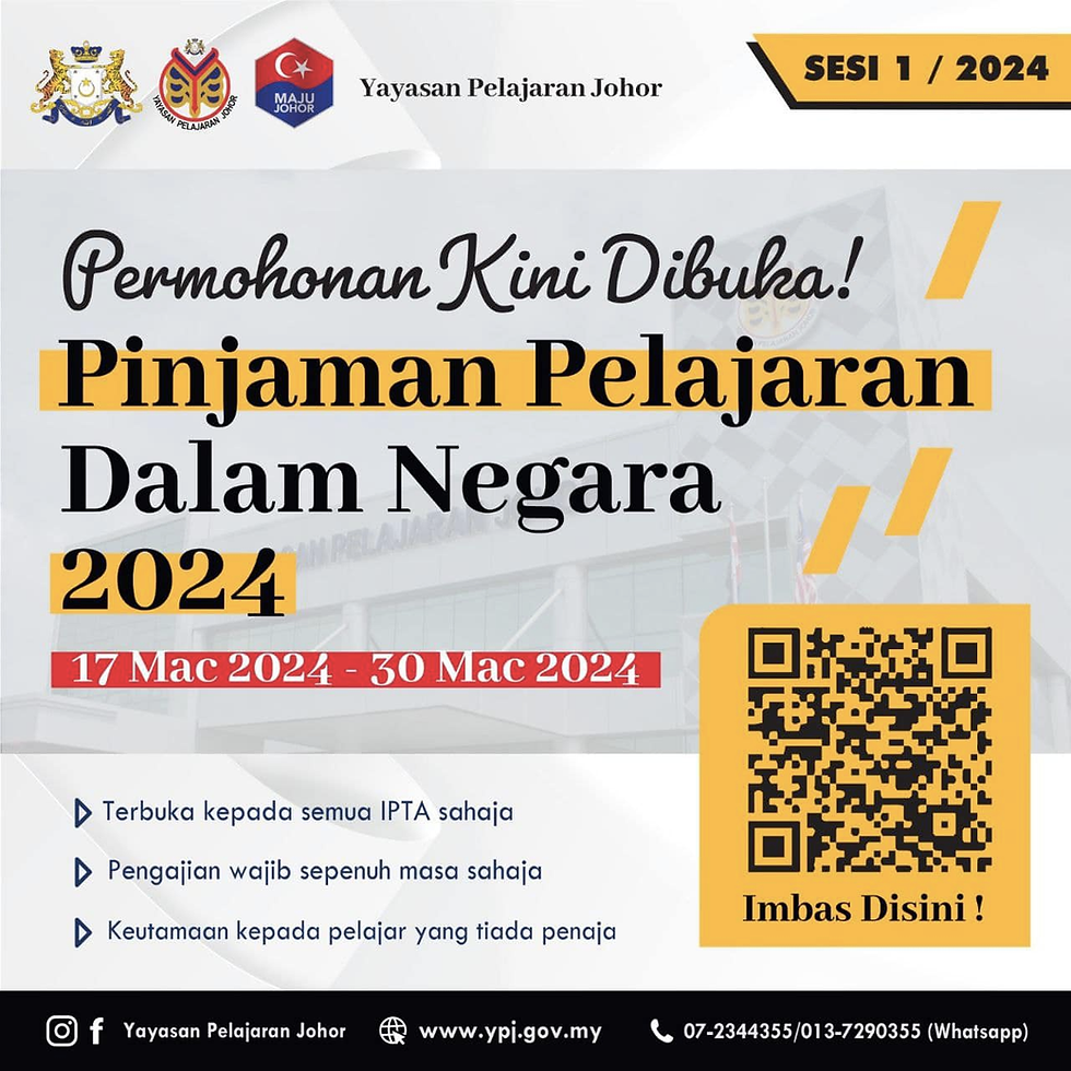 Yayasan Johor Biasiswa Tunku Mahkota Johor Penduduk Johor, SPM ≥ 8A, keluarga berpendapatan rendah Yuran pengajian + elaun sara hidup yayasanjohor.org.my