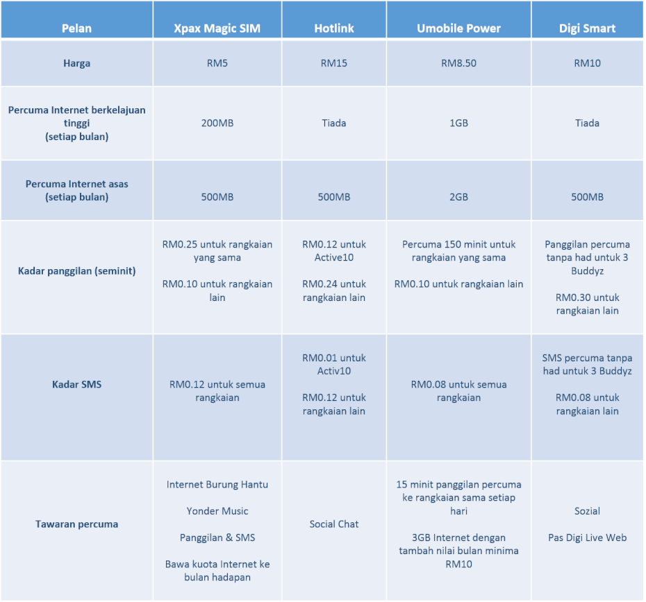| U Mobile | U Prepaid 30 | 30 | 100 Mbps tanpa had | Tanpa kontrak, sesuai prabayar |